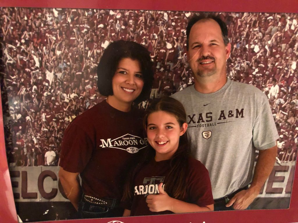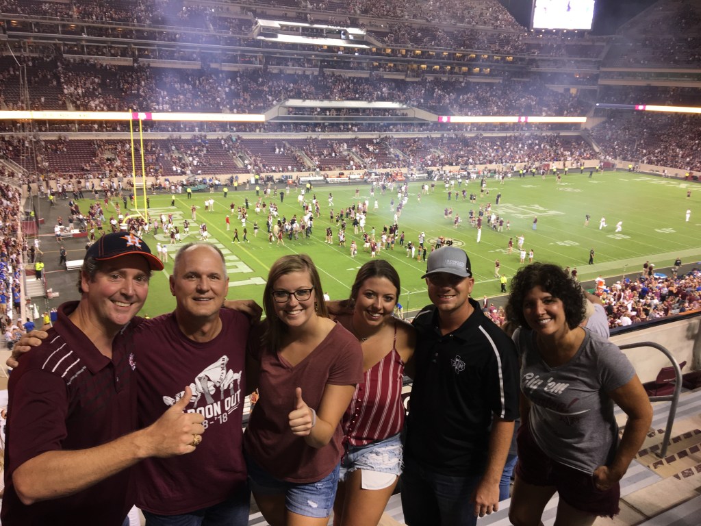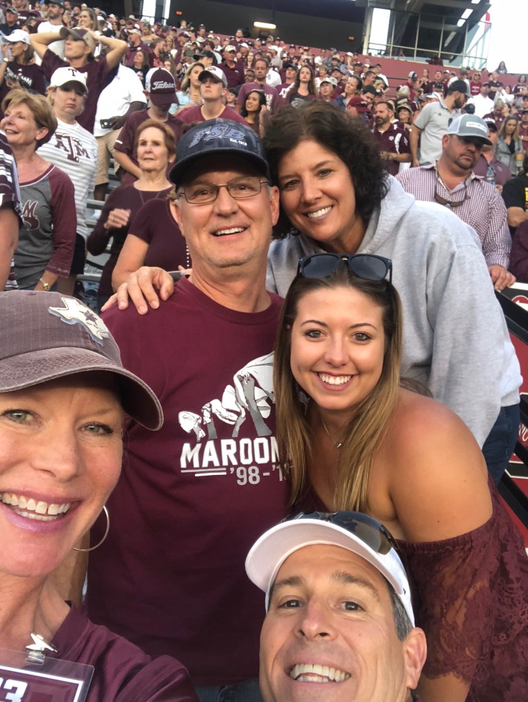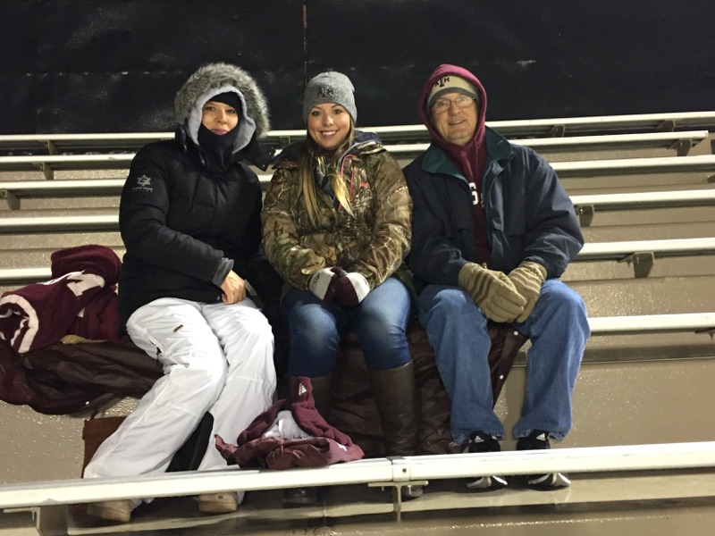 Meet the Moeller family, Pat, Robin, and Laura ‘17 – the most dedicated Aggie sports go-ers I know. What started as a trend of attending a few away games each season turned into not missing a single one for the past 8 seasons. This weekend the Moellers will take one of their shortest road trips and attend their 100th game when we take on the Arkansas Razorbacks at Jerry World in Arlington.