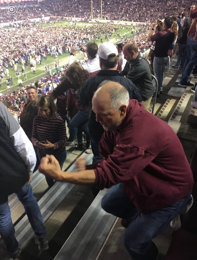 - 2012 at #1 Alabama (29-24) – As expected, the Moellers dealt with trash talk all day from Alabama fans, making the win even sweeter. Their fondest memory from that game was running from the upper deck to the corner where Ryan Swope was standing on the pillar, tho that moment flashed by incredibly fast for the Moellers. Sawing it off on Alabama’s home turf was the icing on the cake. Perhaps the best part of this game was the Indiana fan sitting next to the Moellers, wearing an Alabama shirt. After the Aggies beat Alabama, the Indiana/fake bama fan said he wanted an Aggie shirt, so Pat took his shirt off and gave it to him.