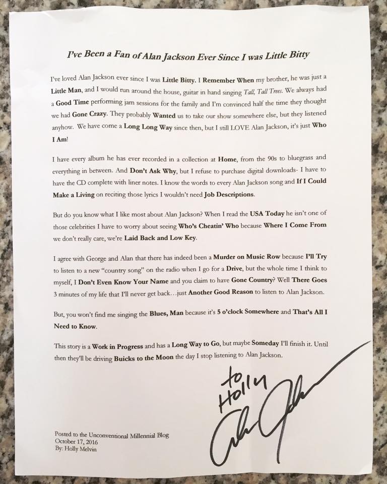 Update June 19, 2017: Today’s mail was fun! Looks like Alan Jackson approves of my pun filled blog post about him – day made!